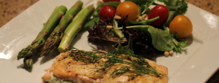 Take 2 lbs. of fresh salmon and cut into smaller portions. If the slices are thick enough, slit the middle and stuff with the goat cheese filling. If the slices are thinner or odd shaped, fold them over the stuffing (secure with toothpick if necessary). Spread the mustard mixture on top, sprinkle with salt and pepper. Bake in large glass dish at 350 degrees for 25 minutes or until the fish is still moist and flaky. Garnish with more fresh chopped herbs and serve with rice or grilled vegetables.